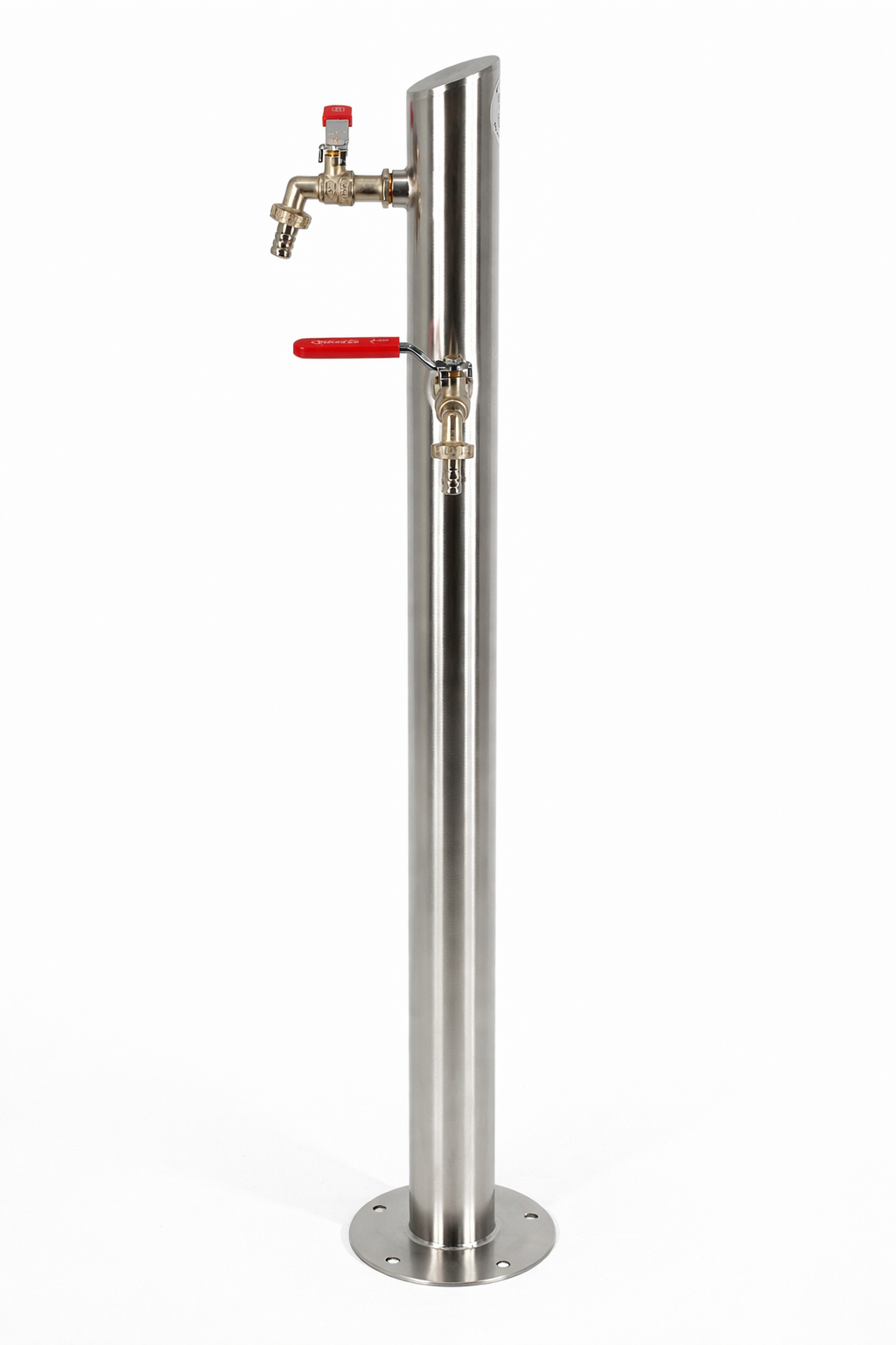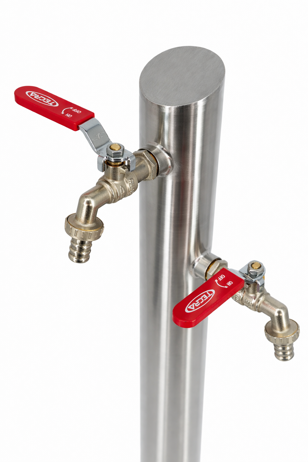 Słupek ogrodowy z dwoma zaworami czerpalnymi do poboru wody z sieci miejskiej, studni lub zbiornika na wodę opadową.